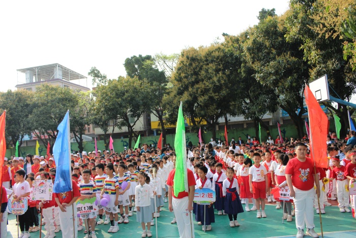 緊隨其后的是各年級(jí)方陣和裁判員方陣,他們笑容燦爛、意氣風(fēng)發(fā),展現(xiàn)了學(xué)生們的青春活力。踏著鏗鏘的節(jié)拍,迎著初升的太陽,全校一到六級(jí)的方陣,井然有序地走過主席臺(tái),接受全校師生的檢閱。少年們揚(yáng)著自信的笑容,手持精心設(shè)計(jì)的展板,強(qiáng)國(guó)有我、活潑奮進(jìn)、弘揚(yáng)傳統(tǒng)文化等主題設(shè)計(jì)方陣;新穎有趣的快閃節(jié)目展現(xiàn)了班級(jí)風(fēng)采。嘹亮有力的班級(jí)口號(hào)響徹云霄,為我們獻(xiàn)上了一場(chǎng)精彩的視聽盛宴。