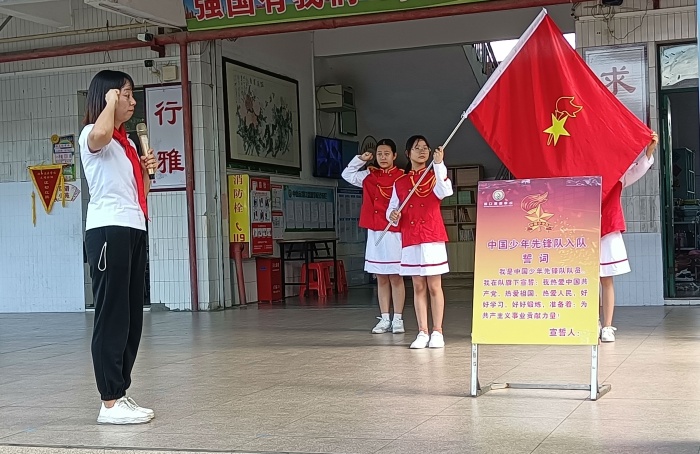 當(dāng)鮮艷的紅領(lǐng)巾在胸前迎風(fēng)飄揚(yáng)時(shí),少先隊(duì)員們倍感自豪。面對(duì)著入隊(duì)誓詞,少先隊(duì)員們?cè)诖箨?duì)輔導(dǎo)員吳曉燕地帶領(lǐng)下莊嚴(yán)宣誓。洪亮的呼號(hào)聲傳遞出小隊(duì)員們激動(dòng)、自豪的心情。緊接著,德育主任陳金祥為各中隊(duì)授旗;隨后,德育校長鄧韶洲宣布新成立中隊(duì)及頒發(fā)中隊(duì)聘書。