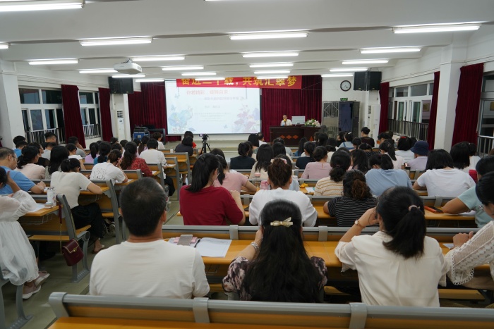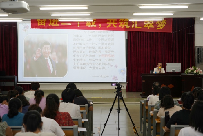 潘主任著力從“立德修身,教師的職業(yè)操守”方面給老師們帶來了心靈上的洗禮。潘主任將師德拆分為“師有理,德有道”,一是希望老師們要有教育理想,不斷地給自己提出追求的目標,保持激情;二是恪守師道,大道于行。牢記習近平總書記對新時代教師的定位,爭做“四有”好老師,爭做學生“引路人”,自覺踐行“四個相統(tǒng)一”;牢記新時代中小學教師職業(yè)行為十項準則,做心中有愛的筑夢人。