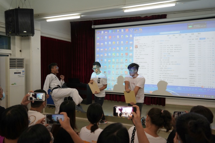 藝體處美貌與智慧并存的楊帆主任也不甘示弱,給一年級(jí)家長(zhǎng)們介紹了藝體處的校本課程。當(dāng)英姿颯爽的跆拳道老師上場(chǎng)展示絕活兒時(shí),現(xiàn)場(chǎng)家長(zhǎng)們紛紛掏出手機(jī),拍照、錄相、鼓掌、喝彩聲連綿不絕,經(jīng)久不息。