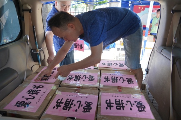 夏天的太陽像個大火爐,把大地烤得發(fā)燙,就連空氣也是熱烘烘的。太陽下的老師一個個汗流浹背的,忙碌地將學生捐贈的書,有序地一箱箱進行打包,希望盡早將書送到廣寧縣孩子手中,因為那沉重的三千多本書籍是廣寧孩子們求知的渴望。