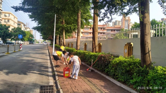 教務主任莫振佩帶領(lǐng)部分人員負責校門口廣學路的垃圾清理,主要包括移除校園周邊花圃里的枯樹枝,清除白色垃圾、煙頭,清掃路邊的樹葉等,大家?guī)R清潔工具很快行動,個別家長志愿者也主動加入勞動隊伍。德育主任許向陽帶領(lǐng)各年級級長們對各年級的教室、走廊、廁所等衛(wèi)生情況進行全面排查,對有疏漏部分立即處理。德育主任梁超勝負責廚房的衛(wèi)生檢查以及校門口、班級、校車上疫情防控物資的落實,如人體測溫儀、消毒液、防護口罩等。校長黃飛躍負責張貼校門口“一米間隔”防控標識和宣傳標語。經(jīng)過一個小時的奮戰(zhàn),自查整改工作初步完成。