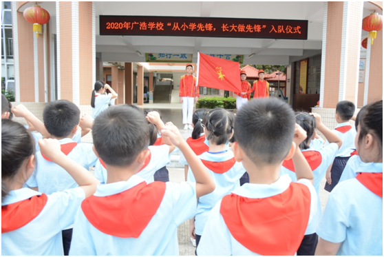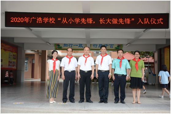 隊旗飄飄,星星火炬閃耀,為慶祝“六一”兒童節(jié),2020年5月29日早上,中山市廣浩學(xué)校少先大隊部組織一年級學(xué)生舉行隆重的“從小學(xué)先鋒,長大做先鋒”主題入隊儀式。廣浩學(xué)校黨支部書記楊善德、少工委主任黃飛躍、德育處許向陽主任、梁超勝主任、團委莫欣老師、少先大隊輔導(dǎo)員陳燕坪老師出席了入隊儀式。