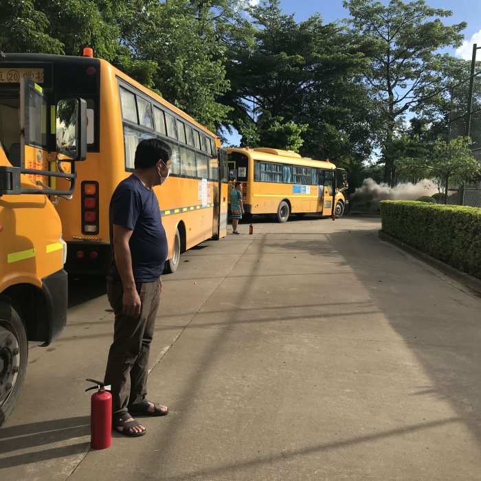 隨后,演練正式開(kāi)始,事先準(zhǔn)備在校道上的煙霧彈一一被引燃,很快,十臺(tái)校車(chē)都浸在滾滾濃煙之中,當(dāng)校車(chē)都到達(dá)預(yù)定地點(diǎn)時(shí),校車(chē)司機(jī)與隨車(chē)?yán)蠋熁ハ嗯浜希M織學(xué)生有序地從前門(mén)及安全門(mén)分頭撤離校車(chē),并按照既定路線疏散到安全地帶。接著,隨車(chē)?yán)蠋熝杆偾妩c(diǎn)乘車(chē)學(xué)生的人數(shù),確保每個(gè)學(xué)生都安全撤離,不遺漏一人。最后,葉寶山主任對(duì)此次演練進(jìn)行了點(diǎn)評(píng),對(duì)同學(xué)們的認(rèn)真、嚴(yán)肅對(duì)待演練的態(tài)度和表現(xiàn)表示了肯定。