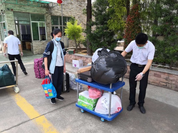 13時(shí)整,初三學(xué)生正式開始報(bào)到。出于安全考慮,在寫著“德恒學(xué)校歡迎高三、初三孩子回家”的紅色帳篷里,返校學(xué)生需要“過五關(guān)斬六將”,比如,站在一米以外向班主任遞交開學(xué)所需資料,由校醫(yī)監(jiān)測(cè)體溫,行李消毒等等,經(jīng)過層層的驗(yàn)核,方能進(jìn)入他們闊別已久的校園,充滿儀式感的返校流程讓疫情之后的復(fù)學(xué)變得更富有意義。除此之外,學(xué)生本次返校和以往最大的不同在于,由于疫情,家長(zhǎng)們只能站在緩沖區(qū)外,目送孩子進(jìn)入校園,所以繁重的行李成了他們最頭痛的事情。事實(shí)證明,家長(zhǎng)和孩子們的擔(dān)憂完全是多余的,由九年級(jí)的科任老師和學(xué)校行政臨時(shí)組成的“德恒搬運(yùn)隊(duì)”,“文能教書育人,武能負(fù)重前行”,整個(gè)過程不遺余力地幫助孩子們運(yùn)送行李,成為當(dāng)日復(fù)學(xué)路上一道亮麗的風(fēng)景線,這樣的暖心之舉得到了在場(chǎng)家長(zhǎng)和學(xué)子們的一致稱贊。
