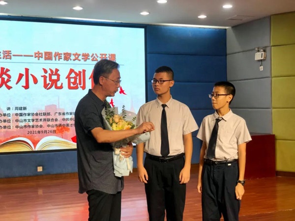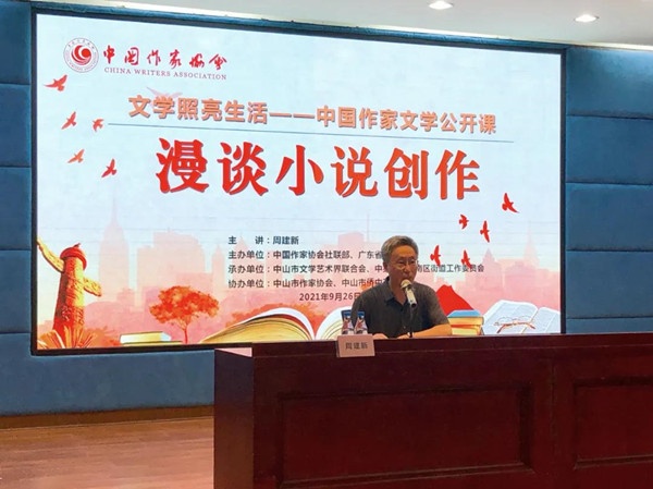 9月26日下午,由中國(guó)作家協(xié)會(huì)社聯(lián)部,廣東省作家協(xié)會(huì)主辦,中山市文學(xué)藝術(shù)界聯(lián)合會(huì)、中共中山市南區(qū)街道工作委員會(huì)承辦,中山市作家協(xié)會(huì)、中山市僑中英才學(xué)校協(xié)辦的“文學(xué)照亮生活——中國(guó)作家文學(xué)公開(kāi)課”走進(jìn)廣東省中山市,在僑中英才學(xué)校一樓多功能廳正式開(kāi)講。全國(guó)少數(shù)民族文學(xué)創(chuàng)作駿馬獎(jiǎng)獲得者、遼寧省作協(xié)副主席周建新以“漫談小說(shuō)創(chuàng)作”為主題進(jìn)行講授,帶給中山文學(xué)愛(ài)好者一場(chǎng)文學(xué)盛宴。
