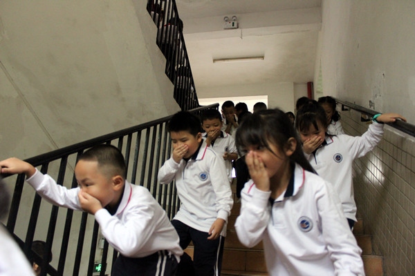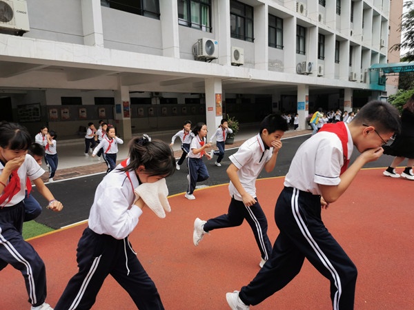 當(dāng)日下午,隨著警報(bào)聲響起,全體師生“火”速行動(dòng)!同學(xué)們聽從指揮迅速排成兩條縱隊(duì),由班主任及科任老師沿疏散標(biāo)志從就近安全出口撤離,大家用手捂住口鼻,彎著身體、快速有序地按照既定的逃生路線,撤離到學(xué)校運(yùn)動(dòng)場,從警報(bào)聲響起到最后一名學(xué)生撤離到廣場,共用時(shí)2分57秒。學(xué)生安全撤離到運(yùn)動(dòng)場后,各班迅速清點(diǎn)人數(shù),確保每一名學(xué)生都已安全撤離,并及時(shí)將清點(diǎn)結(jié)果匯報(bào)給指揮員。