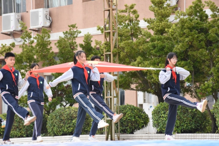 隨著“出旗”一聲令下,國(guó)旗隊(duì)的同學(xué)邁著矯健的步伐向國(guó)旗臺(tái)走來(lái)。在激昂的國(guó)歌聲中,升旗手振臂一揮,鮮艷的五星紅旗徐徐展開,在陽(yáng)光的映照下冉冉升起。三角中學(xué)全校師生肅立,注目著五星紅旗齊唱國(guó)歌,歌聲嘹亮,熱血澎湃。