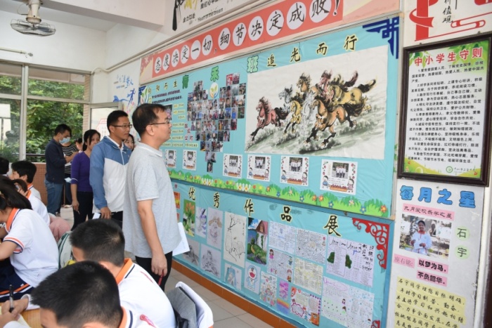 走進(jìn)每一間教室,評(píng)委老師都會(huì)被富有個(gè)性的布置所吸引。作品欄里也是碩果累累,有排布規(guī)整的手抄報(bào)作品,有行云流水的書(shū)法作品,還有五彩斑斕的繪畫(huà)作品,以及各班公示的小組特色組名、口號(hào)、組員介紹等等。
