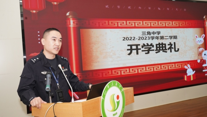 典禮的第三項(xiàng)流程是三角中學(xué)法制副校長(zhǎng)梁吉慶警官為師生們做了一堂法制教育專(zhuān)題講座。梁警官對(duì)學(xué)生法紀(jì)觀念、交通安全、品德養(yǎng)成、安全防范等方面進(jìn)行了有針對(duì)性的講解,讓在校師生更加直觀地了解到提高法制意識(shí)和安全防范意識(shí)的重要性,鼓勵(lì)學(xué)生們好好學(xué)習(xí)、明辨是非,遵守法律法規(guī)。