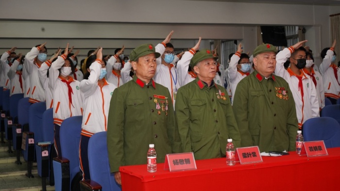 典禮的第二項(xiàng)流程為鎮(zhèn)退伍老兵獻(xiàn)上鮮花,并由鎮(zhèn)退伍老兵翁錦泉發(fā)言。講座現(xiàn)場(chǎng),翁錦泉老先生用生命的故事,向同學(xué)們講述了戰(zhàn)火紛飛年代那一段刻骨銘心回憶。翁錦泉老先生用奉獻(xiàn)無(wú)言,續(xù)寫(xiě)一名老兵的忠誠(chéng)與擔(dān)當(dāng)!我們?nèi)w師生要向英雄致敬,為祖國(guó)奮斗!