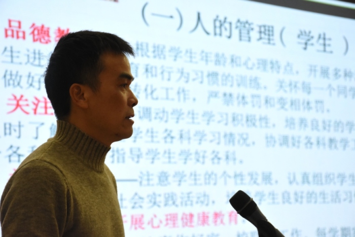 接著,德育處副校長范立宇感謝上學(xué)期班主任的努力和付出,并強(qiáng)調(diào)班主任是學(xué)校各項(xiàng)教育教學(xué)工作的具體實(shí)施者和組織者,是聯(lián)系學(xué)校、家庭、社會(huì)的紐帶和橋梁,班主任工作直接關(guān)系著學(xué)校的穩(wěn)定和發(fā)展,舉足輕重,任重道遠(yuǎn),她希望大家能正確認(rèn)識(shí)到班主任工作的意義、使命和責(zé)任,在工作中要有愛心,有耐心,要嚴(yán)愛相加;要及時(shí)了解學(xué)生的思想動(dòng)態(tài),深入學(xué)生內(nèi)心,善于做學(xué)生的心理與思想工作,熱情呵護(hù)學(xué)生的健康成長與全面發(fā)展;要加強(qiáng)學(xué)習(xí),不斷探究班主任工作技巧,用先進(jìn)的、科學(xué)的教育理念和管理理念指導(dǎo)自身工作,爭做優(yōu)秀班主任。