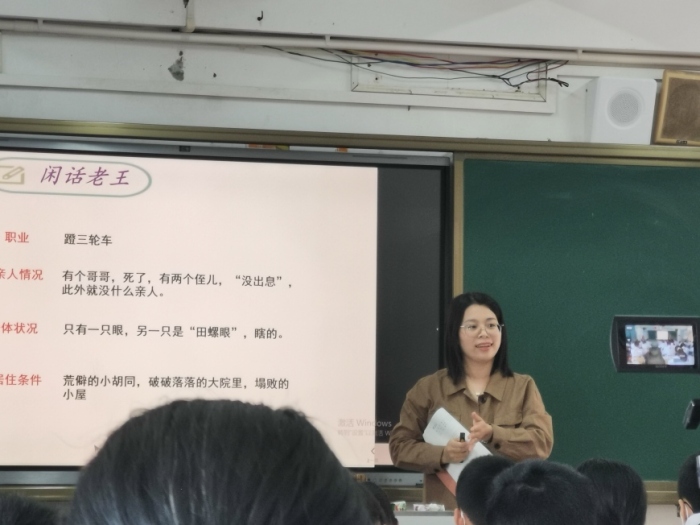 首先,與會老師在初一(4)班聽取黃瑞鳳老師的教研課《老王》。課堂上,黃老師通過“閑話老王,提取基本信息,總結‘不幸’”“受惠老王,揣摩心理,分析善良”“愧對老王,品味語句,反省自我”, 三個教學活動分析人物形象,感知自省精神。黃老師用在對話中填入恰當修飾語、補寫心理活動的方式讓學生走進文本,與文本對話,在文本中感悟,效果很好。
