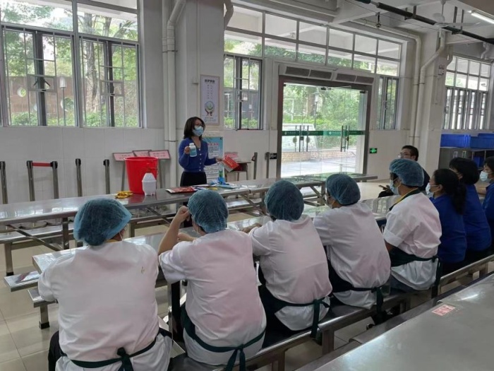 隨后,譚校醫(yī)強(qiáng)調(diào)要嚴(yán)格落實(shí)全校師生、員工(尤其是高風(fēng)險(xiǎn)員工如廚工、保育員等)的癥狀監(jiān)測(cè);加強(qiáng)晨午(晚)檢、因病缺勤登記和病因追蹤,及時(shí)發(fā)現(xiàn)疫情和報(bào)告;科學(xué)處理嘔吐物;做好清潔消毒工作(尤其是環(huán)境表面如門(mén)把手、扶手、公共區(qū)域洗手間等消毒)防止病毒在校內(nèi)擴(kuò)散。同時(shí),做好學(xué)校內(nèi)食品、食堂安全衛(wèi)生、校內(nèi)食物生產(chǎn)加工環(huán)境的管理工作。