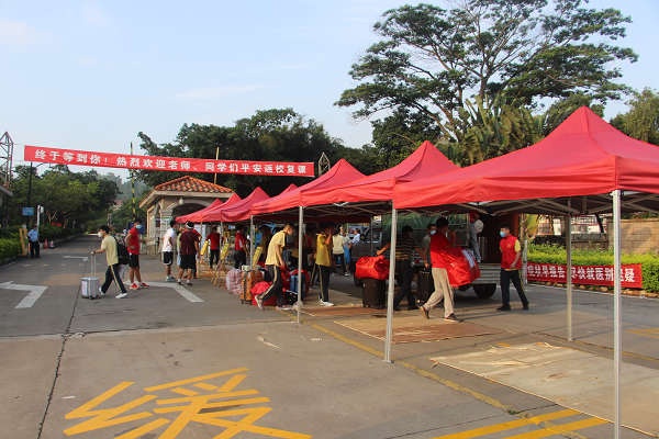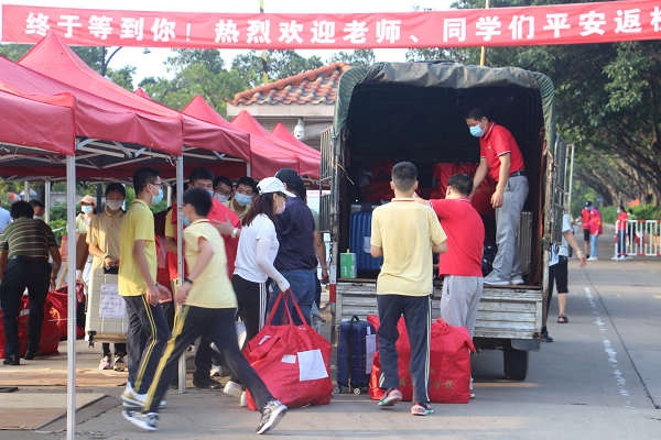 第二批返校復(fù)課學(xué)生三千余人,全部按計劃分批錯峰返校。初中兩個年級分上下午在學(xué)校正門、西門、側(cè)門、后門四個入口分班錯峰返校。每一個班級學(xué)生所對應(yīng)的返校通道、返校時間段及其他各項要求已提前通過給家長發(fā)布的《告家長書》逐一傳達到每一位學(xué)生及其家長,真正做到錯峰、分時、分散返校。為了讓家長無后顧之憂,將學(xué)生送到校門口立刻安心離校,學(xué)校還組織了部分管理人員、初中教師、生活老師、后勤人員以及部分學(xué)生作為志愿者,在各個入口幫助返校學(xué)生卸行李、搬行李,引導(dǎo)學(xué)生檢測體溫等,完成好學(xué)生平安復(fù)課的每一道安全關(guān)卡。
