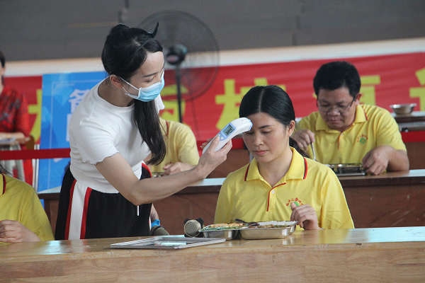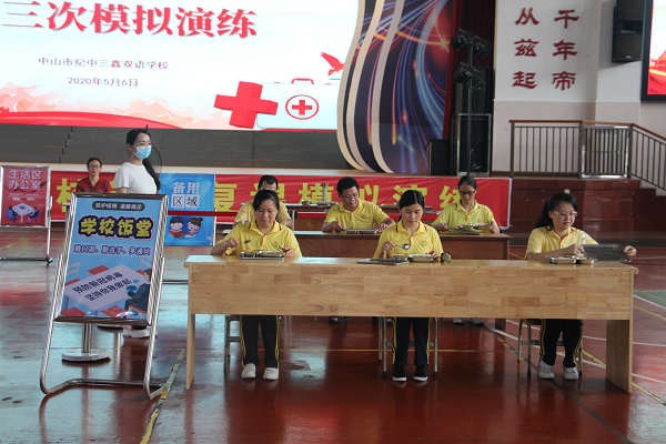 演練從餐前學(xué)生(學(xué)生由生活部老師扮演)排隊(duì)洗手、進(jìn)入餐廳開(kāi)始。學(xué)生在進(jìn)入飯?zhí)们坝行蚺抨?duì)用“七步洗手法”洗手,然后進(jìn)入餐廳隔位而坐,摘下口罩開(kāi)始進(jìn)餐。進(jìn)餐過(guò)程中有學(xué)生咳嗽難受,生活老師發(fā)現(xiàn)后為該生體溫檢測(cè)為37.6℃,立即提醒周邊同學(xué)們佩戴口罩,并通知樓長(zhǎng)帶領(lǐng)周邊同學(xué)到備用區(qū)重新配餐、就餐。生活老師報(bào)告醫(yī)務(wù)室以及生活部主管,帶領(lǐng)該生前往留觀室做詳細(xì)檢查。醫(yī)生為該生做更進(jìn)一步檢查和相關(guān)詢(xún)問(wèn)后,將異常情況匯報(bào)給沈偉忠校長(zhǎng)以及該生的生活老師、班主任。沈偉忠校長(zhǎng)收到反饋信息后,向上級(jí)教育部門(mén)匯報(bào)。校醫(yī)室立即向鎮(zhèn)疾控中心報(bào)告,班主任立即向家長(zhǎng)通報(bào)情況,校醫(yī)通知總務(wù)處安排人員對(duì)餐廳進(jìn)行消毒。最后,疾控部門(mén)到場(chǎng)處理,接學(xué)生到醫(yī)院就診。沈校長(zhǎng)馬上召集相關(guān)部門(mén)的管理人員會(huì)議,啟動(dòng)緊急應(yīng)急處置預(yù)案。