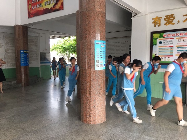 8:10分演練準時開始,在急促的警報聲中,各樓層、走廊負責的老師以最快的速度到達所在的崗位,各班學生在老師有序的組織下,按本班疏散路線迅速有序撤離。在疏散過程中同學們用毛巾輕捂口鼻,低頭彎腰靠右側(cè)快步下樓,撤離有序,行動迅速,沒有奔跑沖撞,同學之間也沒有推拉喧嘩、擁擠踩踏。到達指定位置后,各班迅速整隊,教師清點人數(shù)后,統(tǒng)一向上匯報。