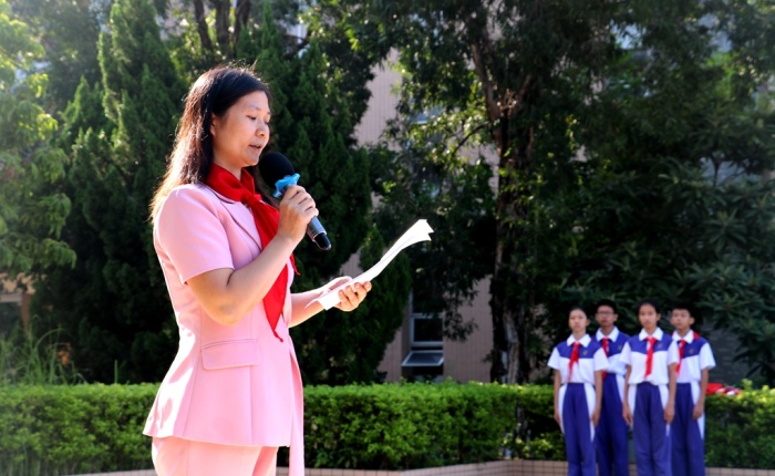 接著,少先隊(duì)員代表龍欣橦同學(xué)進(jìn)行主題發(fā)言。龍欣橦同學(xué)是學(xué)校少先隊(duì)大隊(duì)長、紅色基因宣講員和中山市第八次代表大會正式代表,她向全體少先隊(duì)員發(fā)起號召:牢記和踐行習(xí)近平總書記對少先隊(duì)工作的重要指示和要求,學(xué)習(xí)“四史”,熱愛黨、熱愛祖國、熱愛人民,熱愛社會主義,樹立共產(chǎn)主義遠(yuǎn)大理想和中國特色社會主義共同理想,堅(jiān)定理想信念。作為一名少先隊(duì)員,要愛學(xué)習(xí)、愛勞動、愛鍛煉,要誠實(shí)守信、尊老愛幼、友善待人、樂于助人,要厲行節(jié)約、反對浪費(fèi),積極向上,做到德智體美勞全面發(fā)展。