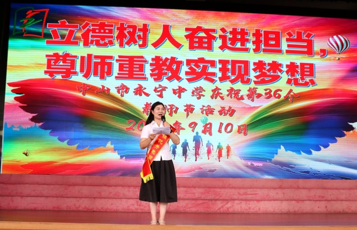 9月10日上午,為深入貫徹落實習(xí)近平總書記“讓教師真正成為最受社會尊重和令人羨慕的職業(yè),在全社會營造尊師重教的良好風(fēng)尚”的重要講話精神,在第36個教師節(jié)來臨之際,中山市永寧中學(xué)隆重舉行了以“立德樹人奮進擔(dān)當(dāng),尊師重教實現(xiàn)夢想”為主題的慶?;顒?。