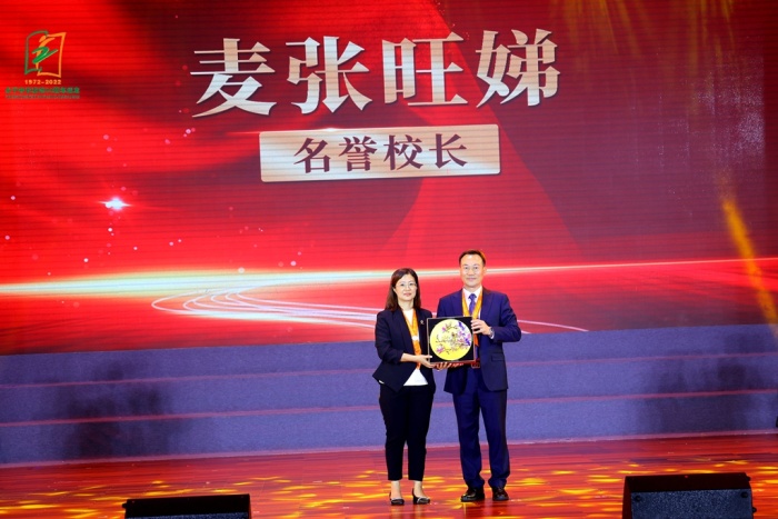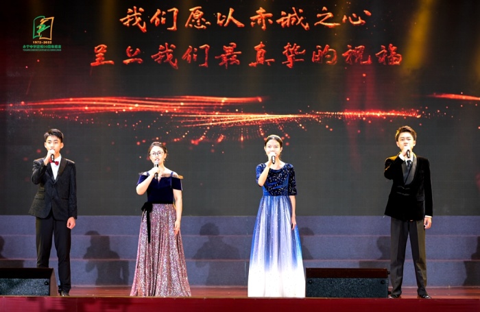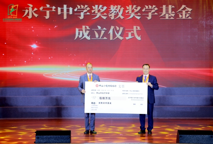 永寧中學(xué)五十年的發(fā)展,離不開辛勤付出的歷任領(lǐng)導(dǎo)與老師,離不開社會(huì)各界的支持和幫助。慶典上舉行了“功勛教師”、“50周年校慶捐贈(zèng)答謝”的頒獎(jiǎng)儀式以及“永寧中學(xué)首屆校友會(huì)授牌典禮”,姜術(shù)俊、趙錫雄、全國(guó)等市鎮(zhèn)領(lǐng)導(dǎo)向功勛教師以及為校慶捐贈(zèng)作出杰出貢獻(xiàn)的個(gè)人和單位贈(zèng)送紀(jì)念品,為校友會(huì)成員頒發(fā)聘書,向?yàn)橛乐邪l(fā)展作出巨大貢獻(xiàn)的教師、優(yōu)秀校友、社區(qū)鄉(xiāng)賢、熱心企業(yè)等表達(dá)最誠(chéng)摯的謝意。永寧中學(xué)首屆校友會(huì)會(huì)長(zhǎng)李添馳在致辭中,代表校友會(huì)籌備組表達(dá)了真誠(chéng)的感謝,號(hào)召校友們積極參加校友會(huì)活動(dòng),支持校友會(huì)工作,融入永中大家庭,建言獻(xiàn)策,團(tuán)結(jié)互助,攜手共創(chuàng)母校美好的明天。隨后,李添馳會(huì)長(zhǎng)代表校友會(huì)把獎(jiǎng)教獎(jiǎng)學(xué)基金的50萬啟動(dòng)資金支票贈(zèng)給了母校,宣告永寧中學(xué)獎(jiǎng)教教學(xué)基金正式成立了。