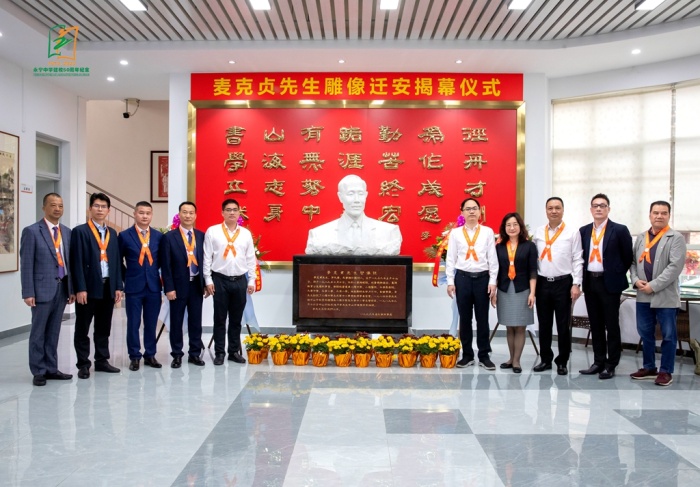 麥克貞先生像遷安揭幕儀式。飲水思源,永中能有今日的輝煌,首先要感謝的是永寧中學(xué)的榮譽(yù)校長(zhǎng)麥克貞先生。麥先生熱心家鄉(xiāng)建設(shè),投資興辦廠企,重視教育公益福利事業(yè),為家鄉(xiāng)建設(shè)和公益事業(yè)作出了重大貢獻(xiàn)。永寧中學(xué)麥克貞先生雕像始建于1992年,在永寧飛駝嶺旁的舊校舍,在2007年遷安至永寧中學(xué)現(xiàn)校址的舊校史室前。2022年,由于升級(jí)擴(kuò)建校史館,今為麥克貞先生像第三次遷安。領(lǐng)導(dǎo)、嘉賓們?yōu)辂溈素懴壬裣窠夷?,學(xué)生們?yōu)辂溈素懴壬I(xiàn)花,表達(dá)敬意。