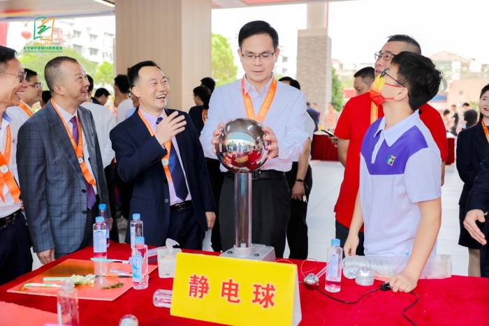 校園嘉年華活動(dòng)既展示了永寧中學(xué)的辦學(xué)特色和辦學(xué)成就,又讓校友們參與其中,精彩紛呈,讓校友嘉賓們流連忘返。即席揮毫潑墨區(qū),小欖鎮(zhèn)書法家協(xié)會(huì)的書法家和欖山八友的藝術(shù)家們,現(xiàn)場(chǎng)揮毫潑墨。藝術(shù)家們氣定神閑,談笑風(fēng)生,頃刻間一幅大作塵埃落定,讓人嘆為觀止。才藝展演區(qū),校友和學(xué)生同臺(tái)演出,節(jié)目形式多樣,有古箏表演、獨(dú)唱、舞蹈、薩克斯演奏,表演聲情并茂,舞姿翩翩,可謂星光璀璨。懷舊游戲區(qū),大人小孩爭(zhēng)先恐后地玩著游戲,有跳房子、踢毽子、滾鐵環(huán)、跳大繩,不亦樂乎??平M互動(dòng)展區(qū)有航模、車模、版畫、剪紙、熱轉(zhuǎn)印產(chǎn)品等,栩栩如生,惟妙惟肖。老師們正在帶領(lǐng)學(xué)生進(jìn)行科技試驗(yàn),引來眾多參觀者饒有興趣地駐足觀看??平M靜態(tài)展區(qū),匯集了學(xué)校的辦學(xué)成果和特色。嘉賓們徜徉在特色展區(qū),感受著永寧中學(xué)的特色文化,對(duì)永寧中學(xué)的辦學(xué)成就和師生們的科技創(chuàng)新贊嘆不已!永中志愿銀行是永寧中學(xué)的一塊德育金字招牌,開戶、寫信、積分換物、有獎(jiǎng)問答等4個(gè)不同的展位,人頭攢動(dòng),讓“善行換積分,積分換歡樂”的理念已經(jīng)深入人心。
