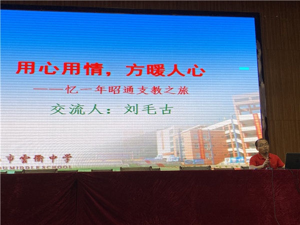 在分享會上,劉毛古老師回顧了其在云南昭通大關(guān)縣一年的點(diǎn)滴支教經(jīng)歷。他首先介紹了支教地點(diǎn)的艱苦生活環(huán)境以及學(xué)生的學(xué)習(xí)環(huán)境,讓人切實(shí)感受到當(dāng)?shù)厣畹钠D辛以及開展教學(xué)的不容易。接著劉老師向老師們分享在云南支教開展的各項(xiàng)工作,如:面對“學(xué)困生”學(xué)習(xí)質(zhì)量低下的壓力,他思對策、想辦法,努力提升所教班級的教學(xué)質(zhì)量。此外,參加學(xué)校管理,帶去云衢理念;參與語文教學(xué),助力提升當(dāng)?shù)亟虒W(xué)質(zhì)量;參與開展各類課堂教學(xué)調(diào)研,推廣課改理念;開設(shè)講座、專題培訓(xùn)等,參與當(dāng)?shù)亟萄谢顒?dòng)。他在分享會中談到,在各方力量的堅(jiān)持和用心努力下,使當(dāng)?shù)亟虒W(xué)質(zhì)量有所提高,這其中也有云衢中學(xué)和中山各方力量的關(guān)心、支持和幫助,使得名城中山愛傳千里,云南人民生活有明顯提高。最后,劉老師向老師們分享了支教中所得的七點(diǎn)感悟啟迪:對他人要有體諒之心;對工作要有進(jìn)取之心;對學(xué)生要有關(guān)愛之心;對單位要有善待之心;對困境要有思變之心;對生活要有感恩之心;對名利要有恬淡之心。短暫的幾十分鐘,劉老師的分享會深深感染了在座的老師們。