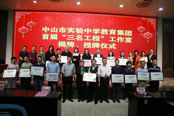 會(huì)議伊始,副校長(zhǎng)何麗嫻宣讀成立實(shí)中教育集團(tuán)首屆“三名工程”工作室決定和名單,經(jīng)個(gè)人申報(bào)、專家評(píng)審、黨委討論等環(huán)節(jié),共遴選出名校長(zhǎng)工作室1個(gè)、名教師工作室(含1個(gè)青年領(lǐng)軍人才培養(yǎng)對(duì)象工作室)9個(gè)、名班主任工作室4個(gè)以及133名工作室成員。其后,市教師發(fā)展中心主任洪世林,石岐街道辦事處教育和體育事務(wù)指導(dǎo)中心主任謝永芳,實(shí)中校長(zhǎng)蔣曉敏、副校長(zhǎng)何麗嫻、楊文輝以及工作室主持人代表王明義、周麗麗、張彥共同為“中山市實(shí)驗(yàn)中學(xué)教育集團(tuán)‘三名工程’工作室”揭牌。