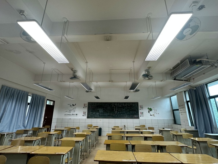 新學(xué)期開學(xué),在實(shí)中高一年級(jí)教室內(nèi),同學(xué)們正在奮筆疾書,改造后的LED護(hù)眼燈整齊懸掛在教室頂上,光線充足且柔和,為學(xué)生們營造出健康良好的學(xué)習(xí)環(huán)境。