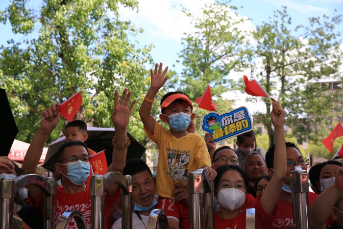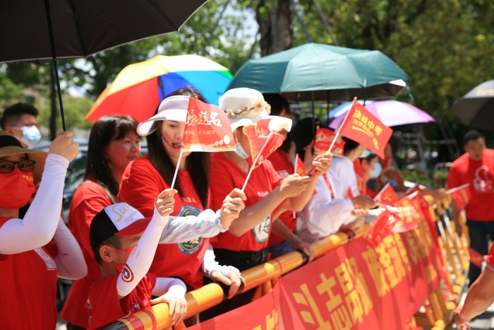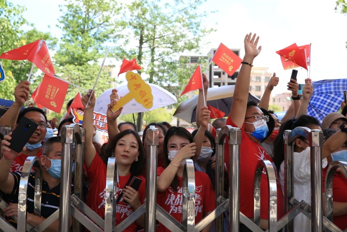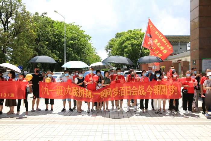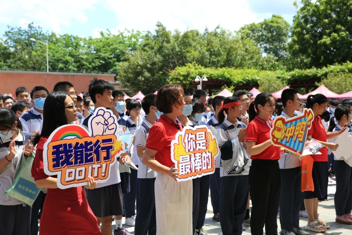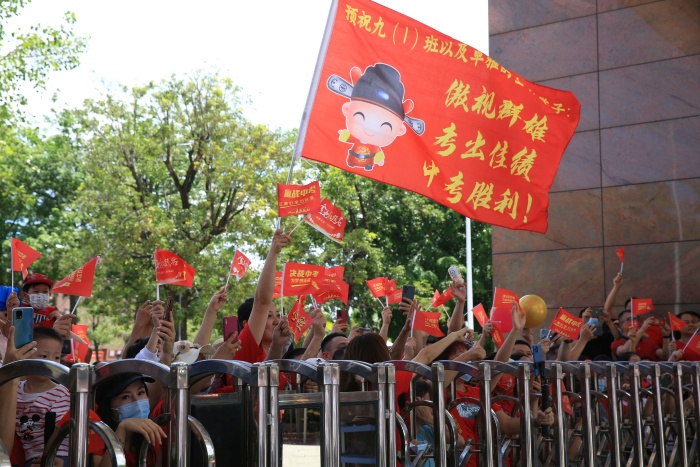 下午,炎熱的天氣擋不住師生和家長(zhǎng)的熱情。13點(diǎn)30分,學(xué)校南大門擠滿了前來送考的家長(zhǎng)們,他們揮舞著寫有“傲視群雄、考出佳績(jī)、中考勝利”的旗子,身著印有“旗開得勝”字樣的送考服、旗袍,各班家委還精心制作了加油橫幅,為考生加油。