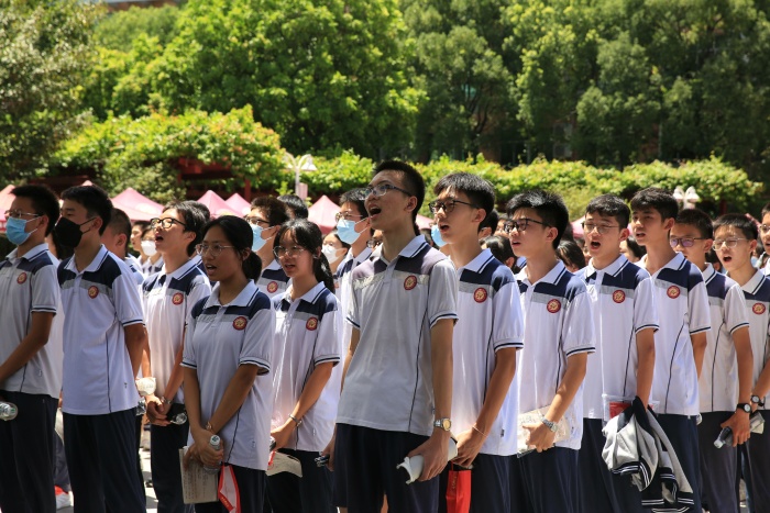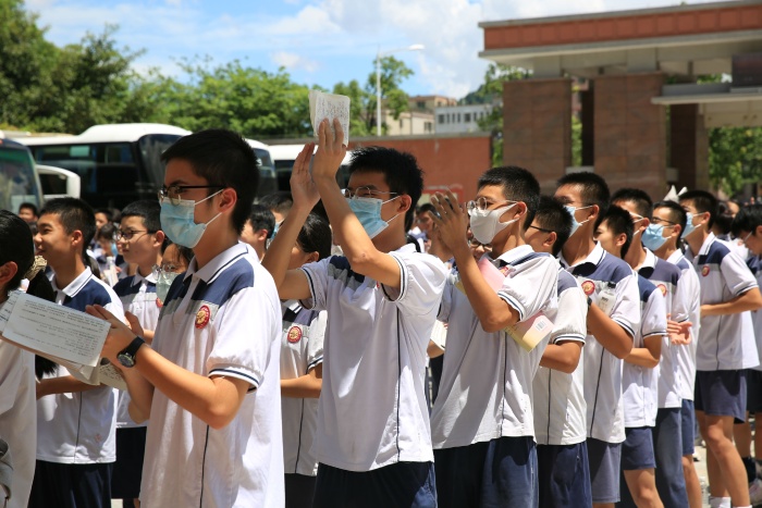 早上開考的學(xué)科是初二地理生物學(xué)科。七點(diǎn)鐘,八年級(jí)的老師們便身穿喜慶的紅色送考服來到學(xué)校?!袄蠋熇蠋熚瘴帐郑瑢懙亩紝?duì),科科都會(huì)……”同學(xué)們看到前來送考的老師,一擁而上跟老師握手,希望能沾點(diǎn)喜氣運(yùn)氣。送考儀式上,初中部校長(zhǎng)李文致辭,“希望同學(xué)們能夠以平常心走進(jìn)考場(chǎng),拿出自己最好的狀態(tài),自信應(yīng)考、細(xì)心作答。”李文希望同學(xué)們不要給自己太大的壓力,相信自己一定能夠取得理想的成績(jī)。