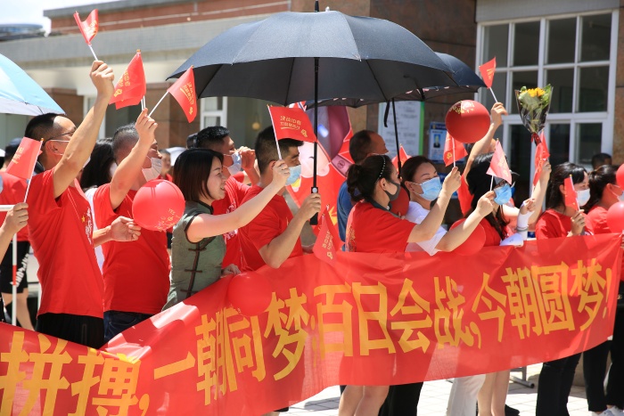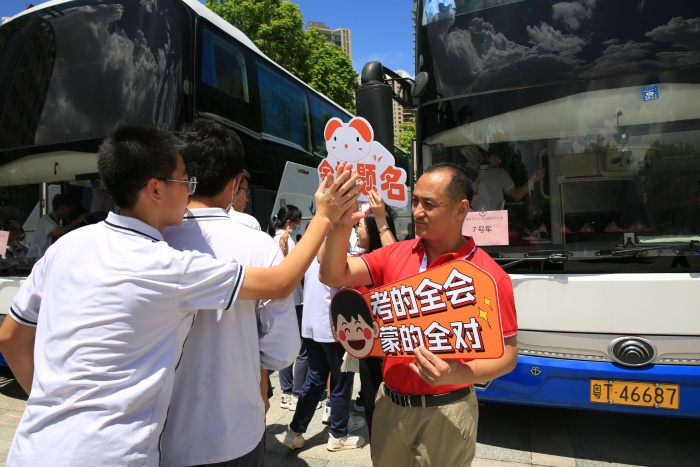 “請(qǐng)父母放心,我們必將馬到成功,中考必勝!中考必勝!中考必勝!”臨上車前,初三年級(jí)的同學(xué)們跑向頂著烈日為自己加油的爸爸媽媽,向他們表達(dá)自己中考必勝的信心。