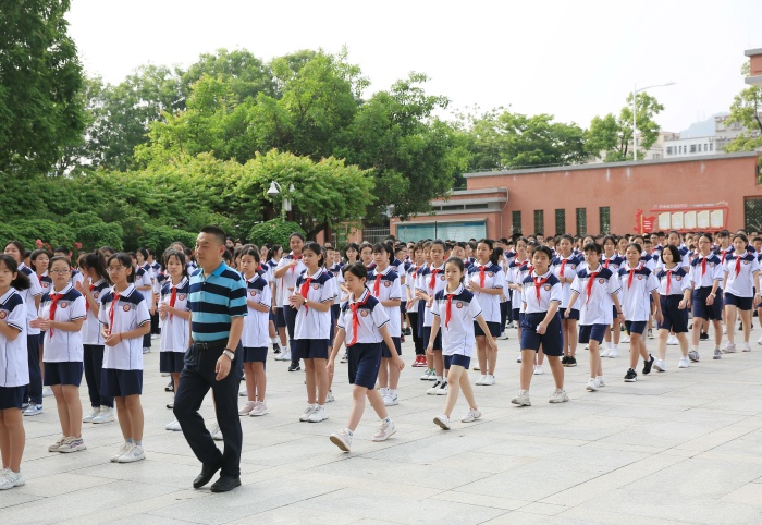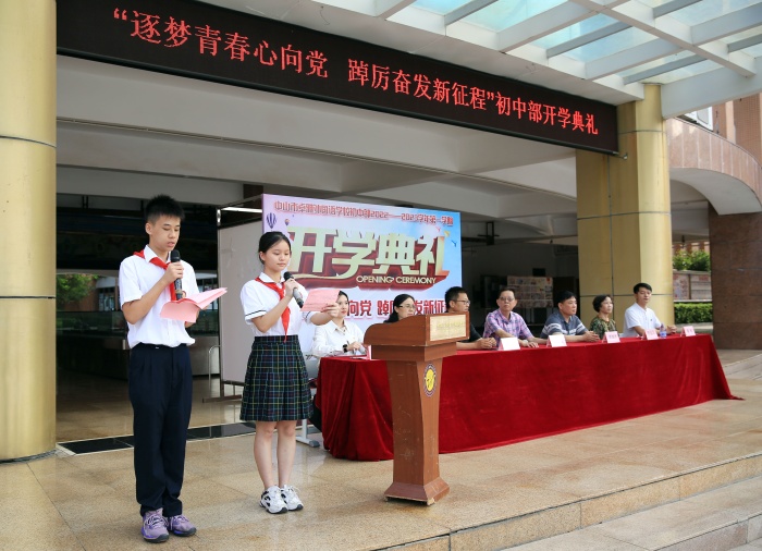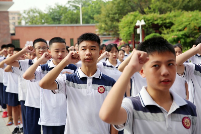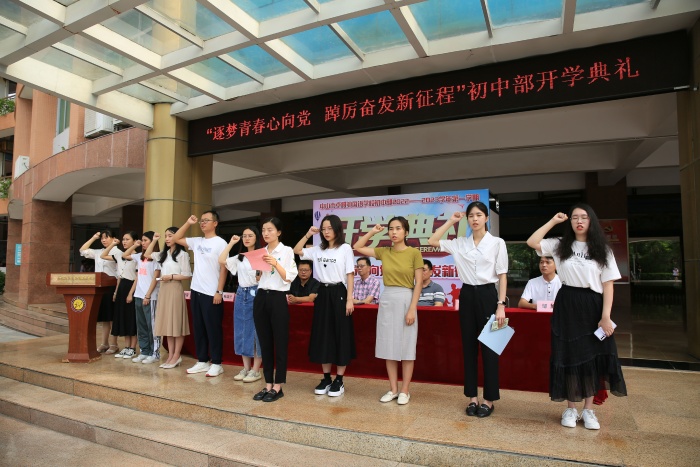 初中部的開學典禮別開生面,為了展示新加入卓雅的七年級學生的精神風貌,典禮上,七年級的同學們在各班班主任老師的帶領下,精神抖擻地步入會場,新入職初中部的11名教師也依次上臺,握拳宣誓,訴說自己的教育格言。