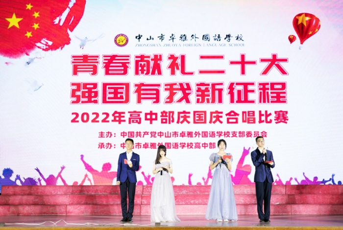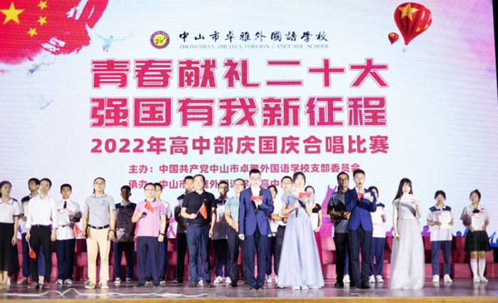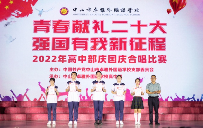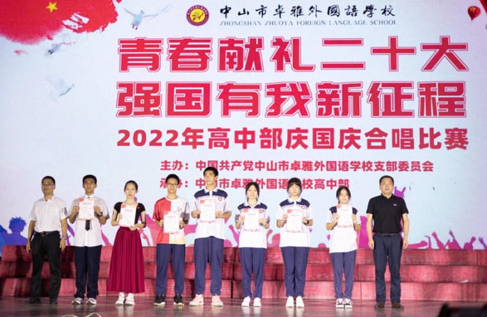 9月29日晚,由中國共產(chǎn)黨中山市卓雅外國語學校支部委員會主辦,高中部承辦的“青春獻禮二十大,強國有我新征程”合唱比賽在卓雅外校體育館舉行,通過合唱愛國歌曲,營造團結(jié)、嚴肅、歡快、活潑的校園氛圍。經(jīng)評比,高一(1)、(8)、(12)班,高二(1)、(6)班榮獲比賽一等獎,高中部校長畢文龍、學生處主任王仕誠、教學處主任韓向黨等觀看演出并為獲獎班級頒獎。