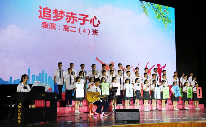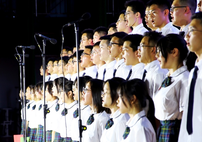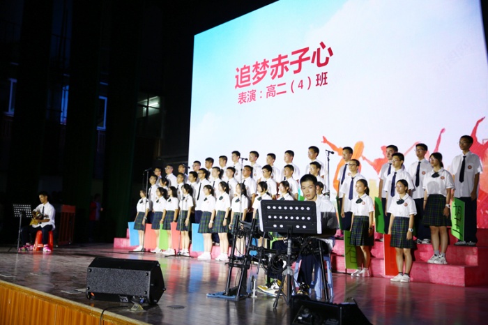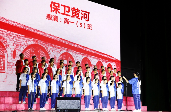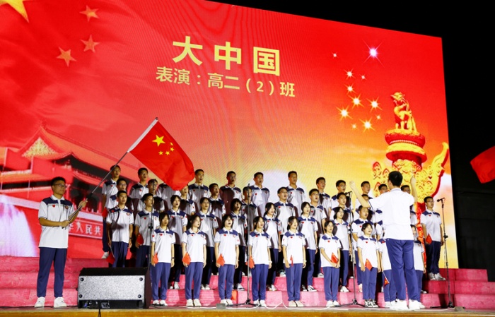 “我和我的祖國,一刻也不能分割,無論我走到哪里,都流出一首贊歌……”比賽現(xiàn)場,有《我和我的祖國》《黃河大合唱》《國家》等令人振奮與感動的經(jīng)典紅色歌曲,也有《追夢赤子心》《少年中國說》《明天會更好》等勵志歌曲,各班還將吉他伴奏、街舞、朗誦、說唱等元素融入合唱之中,有的班級還動用無人機懸掛小國旗飛躍舞臺,引來臺下觀眾的陣陣歡呼,高中部音樂教師楊駿、唐明璐也傾情演唱歌曲《萬疆》,將現(xiàn)場氛圍推向高潮……