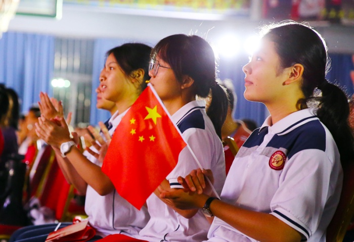 最后,全體師生齊唱《歌唱祖國》,嘹亮而有力的歌聲、高舉揮舞的國旗,深情詮釋了全體師生對黨、對祖國、對人民的深深摯愛和款款祝福,喚起了同學們對崢嶸歲月的集體記憶,也喚起了師生們不畏困苦、勇往直前的斗志。
