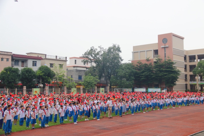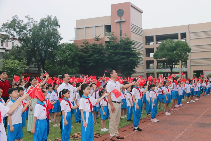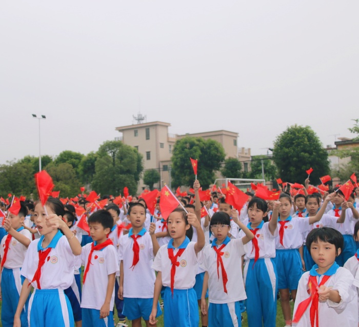 7:50,各班老師組織分發(fā)愛(ài)心貼紙和手持小國(guó)旗,整個(gè)校園洋溢著慶國(guó)慶迎中秋的歡樂(lè)氣氛;8:00,進(jìn)行曲廣播音樂(lè)響起,各班學(xué)生迅速集隊(duì),有序行進(jìn),每個(gè)人臉上都是喜悅的笑容。今天的綠茵場(chǎng),是一片紅色的海洋,涌動(dòng)著三角小學(xué)全體師生的興奮和期待。當(dāng)鮮艷飄揚(yáng)的國(guó)旗徐徐升起,師生們滿懷崇敬注視國(guó)旗;當(dāng)雄壯激昂的國(guó)歌聲響起,師生們一臉動(dòng)容同唱國(guó)歌。右胸的愛(ài)心貼紙似乎燃燒起來(lái),那是師生們對(duì)祖國(guó)炙熱的愛(ài);左手置于胸前的小國(guó)旗似乎愈發(fā)紅艷,那是師生們對(duì)祖國(guó)真誠(chéng)的祝福。升旗儀式過(guò)后,全校師生還同唱中國(guó)少年先鋒隊(duì)隊(duì)歌,高舉左手揮動(dòng)小國(guó)旗,表達(dá)自己對(duì)祖國(guó)的熱愛(ài)與自豪。