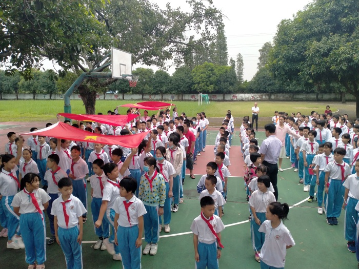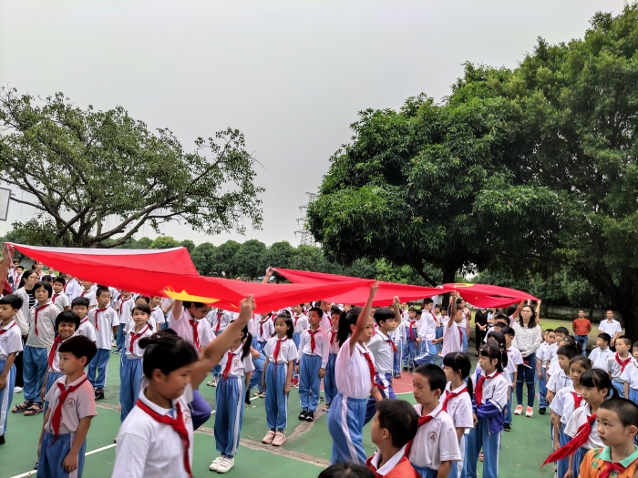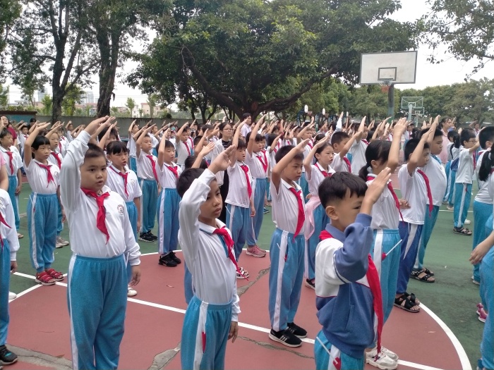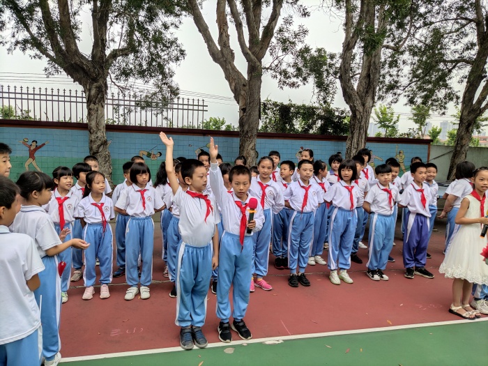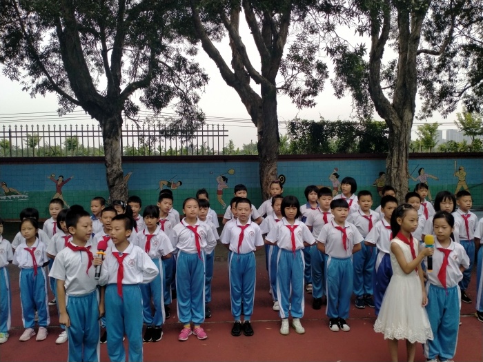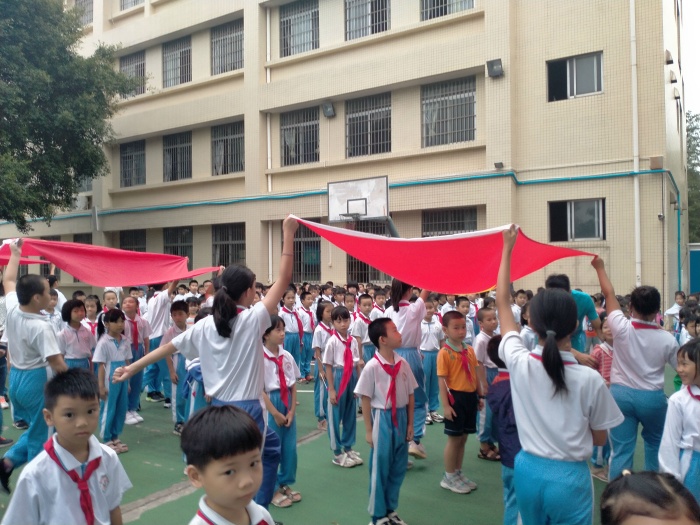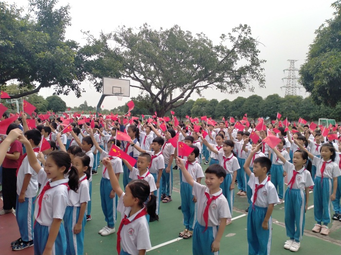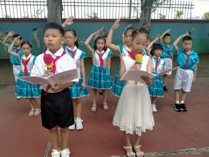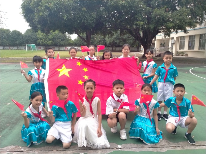 緊接著,學校旗手代表們邁著整齊劃一、鏗鏘有力的步伐,高高舉起國旗、黨旗和隊旗,從學生的隊列中莊嚴走過,全體師生行注目禮?!奥狘h話、感黨恩、跟黨走”深深地烙在幼小的心靈里。