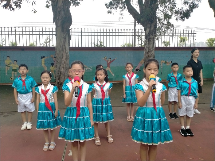 在老師的帶領下,師生們揮動著手中的小國旗,齊唱《我和我的祖國》,用飽含深情的歌聲表達對祖國母親的祝福。