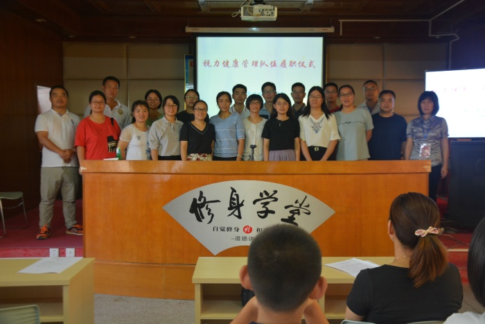 活動(dòng)議程分為五部分,盧喆老師介紹了學(xué)生視力健康管理隊(duì)伍的組成和各個(gè)崗位的職責(zé)。視力健康管理領(lǐng)導(dǎo)小組組長范立宇發(fā)表了《保護(hù)視力,呵護(hù)心靈之窗》的講話,她在講話中突出強(qiáng)調(diào)視力健康的重要性,要求教師、家長、學(xué)生都能夠?qū)⒁暳】档墓芾砉ぷ髯龅匠B(tài)化。緊接著彭紅蓉代表家長作了《在家如何保護(hù)孩子眼睛視力》的發(fā)言。然后全體學(xué)生視力保護(hù)委員共同宣誓,最后與會(huì)人員進(jìn)行了合影留念。