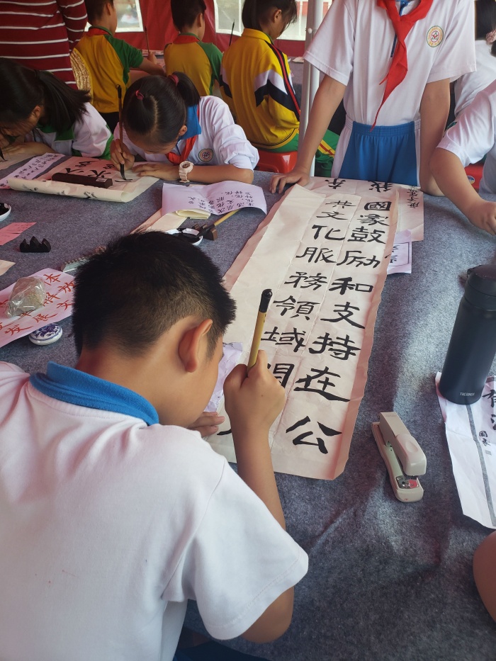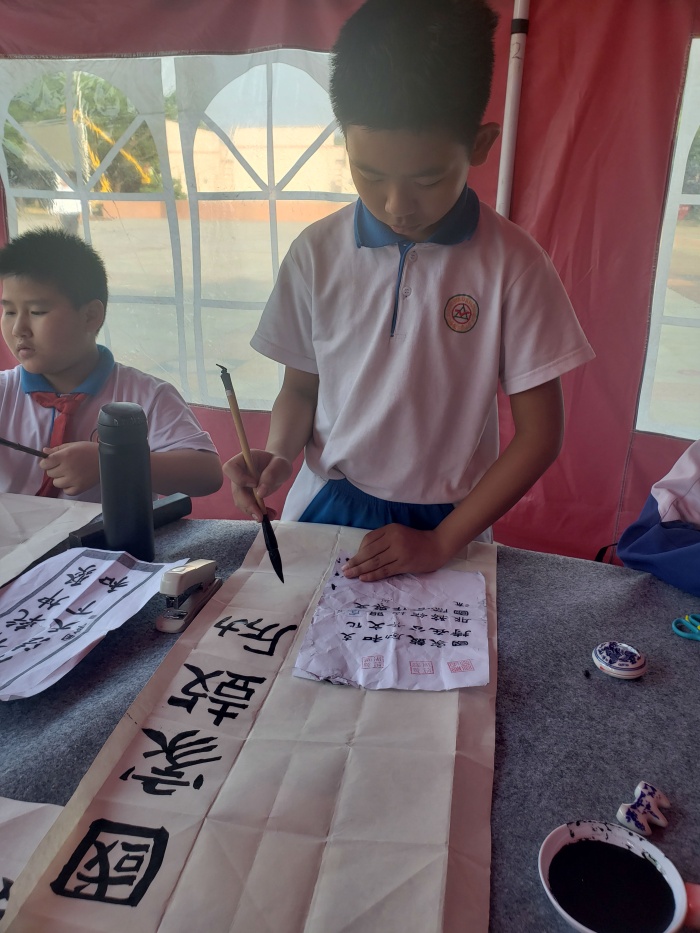 比賽當天,三角小學林海宜和陳姻伊兩位美術老師帶領學生前往比賽現(xiàn)場——三角文化廣場參賽,同學們斗志昂揚、充滿自信地迎接挑戰(zhàn)。賽場上,同學們精神抖擻,立定心志,握筆正確,坐姿端正,表現(xiàn)出良好的書寫習慣,所寫的作品筆畫流暢??瑫鴻M平豎直,結構勻稱;隸書整體美觀,游刃有余。同學們在規(guī)定時間內完成了自己較為滿意的書法作品。