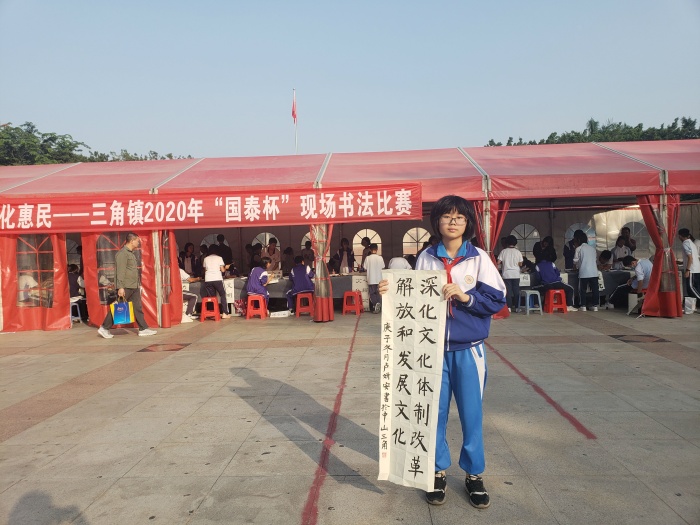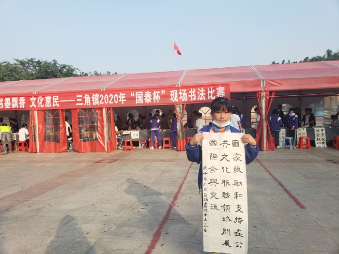 為統(tǒng)籌推進文化建設,豐富群眾業(yè)余文化生活,三角鎮(zhèn)面向社會各界和全鎮(zhèn)中小學師生,于11月24日下午3:00在三角鎮(zhèn)文化廣場舉行了一場別開生面的2020年“國泰杯”書法比賽。三角鎮(zhèn)三角小學吳俊汶、周筱涵等9名學生代表參加了本次活動。