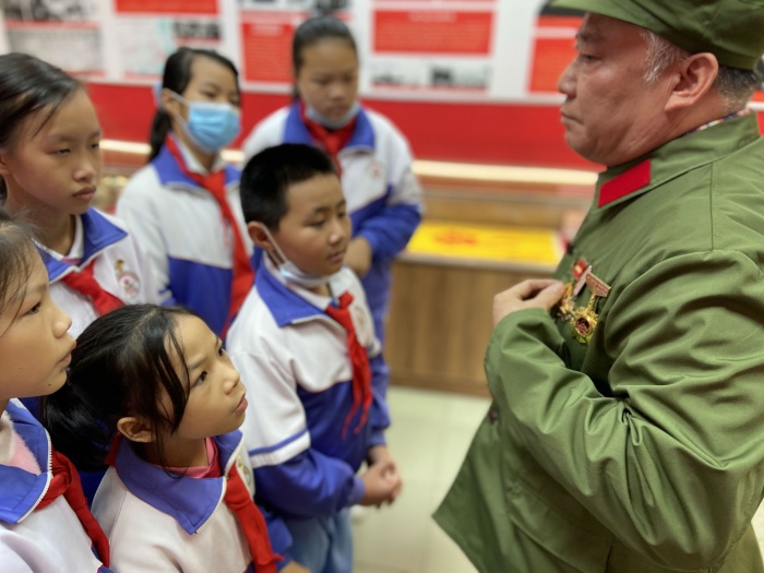 參加活動的少先隊隊員們首先來到了三角鎮(zhèn)退役軍人服務中心,隊員們聆聽了在越南戰(zhàn)爭中立下偉大功績的老兵翁錦泉爺爺講述的戰(zhàn)斗故事。孩子們一個個聽得專心致志,被吳爺爺的英勇事跡深深地感動了,心中肅然起敬,臉上情不自禁地流露出自豪的神情。