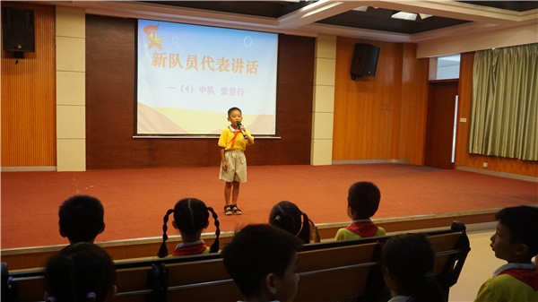 莊嚴(yán)宣誓后,一(4)中隊(duì)的張景行隊(duì)員作為新隊(duì)員代表發(fā)言,他表達(dá)了無比愉悅的心情和積極向上的決心。學(xué)校少工委大隊(duì)輔導(dǎo)員鐘老師為各個(gè)中隊(duì)授中隊(duì)旗;德育主任謝萬明主任為一年級(jí)各中隊(duì)的中隊(duì)輔導(dǎo)員頒發(fā)聘書,看著鮮艷的紅領(lǐng)巾和矗立的中隊(duì)旗,新隊(duì)員們異常興奮,全場(chǎng)響起了熱烈的鼓掌聲和吶喊聲。