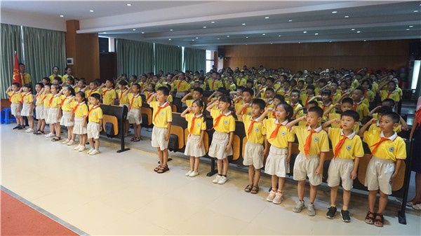 為迎接這次入隊(duì)儀式的到來,一年級(jí)各中隊(duì)提前開展了隊(duì)前教育,觀看隊(duì)知識(shí)視頻、學(xué)習(xí)隊(duì)歌、填寫入隊(duì)申請(qǐng)書……幫助新隊(duì)員們樹立“紅領(lǐng)巾小主人”意識(shí)。7月10日上午8點(diǎn),一年級(jí)同學(xué)穿著整齊的校服,踏著堅(jiān)定的步伐有序地來到階梯室,等待著他們?nèi)松械谝淮我饬x非凡、激動(dòng)人心的時(shí)刻——加入光榮的中國(guó)少年先鋒隊(duì)組織。