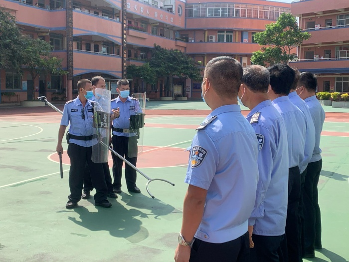 接著,鄭觀明警官和黃偉龍警官宣布大家進入“突發(fā)事件應急處置”演練環(huán)節(jié)。情境設定:由一名便衣民警同志模擬充當危險分子的角色,手持兇器對護校隊員進行攻擊,試圖沖擊校園安保防線。護校隊當即進入突發(fā)情況應急狀態(tài),保安和護校隊員們快速組成合作小組,一邊利用手中的鋼叉、盾牌和警棍等器械與危險分子周旋,同時啟動一鍵報警系統(tǒng),護校隊員們各就各位,迅速聯(lián)系肖家村派出所和西山村委治保會力量,協(xié)力將危險分子制服。