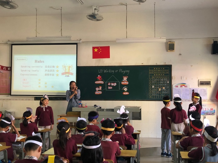 本次活動(dòng)主要包括課堂展示課、說課和評(píng)課環(huán)節(jié)。首先,第一節(jié)課堂展示課是新圩小學(xué)劉麗雁老師四年級(jí)的U7 Working or Playing的故事課。劉老師通過故事前知識(shí)背景的激活,故事中問題的設(shè)疑,故事后的表演和復(fù)述,教學(xué)設(shè)計(jì)環(huán)環(huán)緊扣,層層遞進(jìn),讓學(xué)生在輕松活躍的課堂氛圍中掌握了故事內(nèi)容。