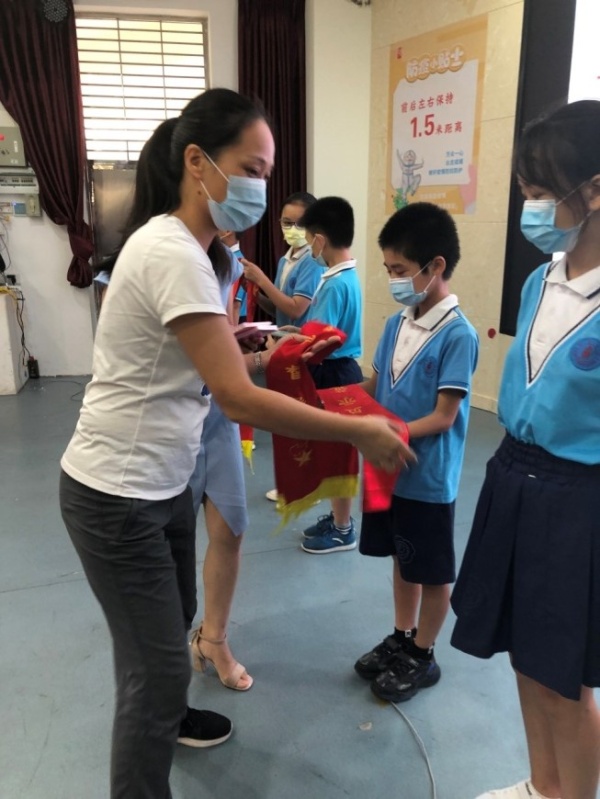 最后,各年級組長為文明督導員們頒發(fā)記錄本和紅飄帶,文明督導員們拿著記錄本,將認真記錄同學們的行為情況,披上紅飄帶,將努力承擔起創(chuàng)建文明班級、文明校園的責任。