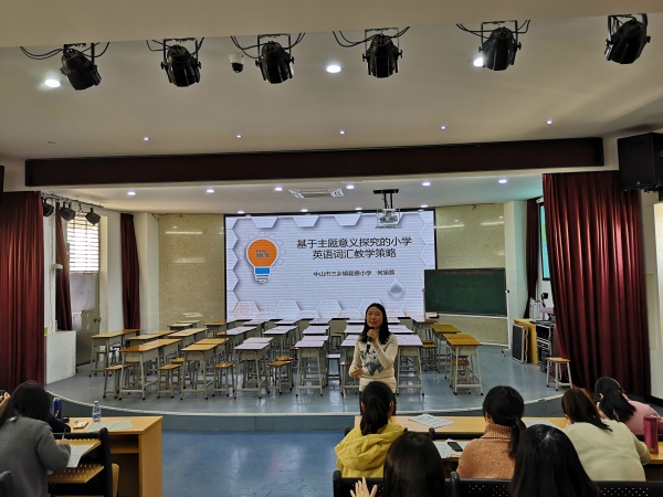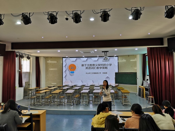 為了讓聽評課更有針對性,第二環(huán)節(jié)由三鄉(xiāng)鎮(zhèn)小學(xué)英語學(xué)科研究委員會的何旭蓉主任帶來一場題為《基于主題意義探究的小學(xué)英語詞匯教學(xué)設(shè)計(jì)》的講座。首先,何主任在講座前對新銳營的學(xué)員進(jìn)行了問卷調(diào)查,圍繞三個(gè)問題與青年教師進(jìn)行互動:您是如何開展詞匯教學(xué)的?您是否嘗試過依托語篇開展詞匯教學(xué)?如果有,您是運(yùn)用什么策略進(jìn)行的?接著,何主任引用普通高中英語課程標(biāo)準(zhǔn)(2017版)和現(xiàn)場老師們進(jìn)行探討主題意義探究的概念內(nèi)涵。引用程曉堂教授的話:所有語言學(xué)習(xí)活動都應(yīng)該是在一定的主題語境下進(jìn)行的,有效地向老師們傳遞一個(gè)理念:英語教師要具有語篇教學(xué)的意識。那怎么依托語篇來開展詞匯教學(xué)呢?何主任指出可以從三種渠道進(jìn)行,分別是自創(chuàng)語篇、改編語篇和使用原版語篇。然后深入剖析載德小學(xué)英語科組語篇教學(xué)的三個(gè)案例成果進(jìn)一步說明語篇補(bǔ)充的原則、目標(biāo)、策略,讓現(xiàn)場老師們對如何通過文本補(bǔ)充踐行主題意義探究的詞匯教學(xué)有了更深刻的理解。