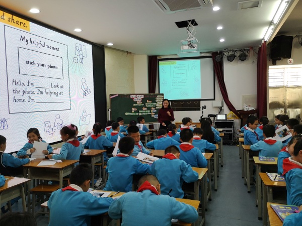 本次活動分為兩個(gè)部分。第一環(huán)節(jié),由載德小學(xué)青年教師駱倩盈老師為大家展示一節(jié)四年級上冊Unit 8 Helping at Home的第二課時(shí)。這是一節(jié)文本補(bǔ)充視角下的詞匯教學(xué), 補(bǔ)充的語篇 選自譯林牛津版5B Unit 5 Helping Our Parents故事板塊,與本單元Helping at Home的主題吻合。語篇內(nèi)容講述了Mike一家周六在家正在做家務(wù)的情景。在導(dǎo)入環(huán)節(jié),駱老師通過觀看視頻,利用housework話題展開多角度的聯(lián)想,激活學(xué)生的背景知識,有效地激發(fā)學(xué)生的學(xué)習(xí)動機(jī)。在呈現(xiàn)和操練環(huán)節(jié),通過觀察插圖、預(yù)測文本、觀看視頻、回答問題、回歸語篇、復(fù)述故事等一系列的任務(wù)讓學(xué)生用目標(biāo)語言對故事內(nèi)容進(jìn)行預(yù)測,逐步理解故事,發(fā)散學(xué)生的批判性思維,幫助學(xué)生再次創(chuàng)造性地使用語言。最后環(huán)節(jié)的“My Helpful Moment”的拓展活動,更是升華了本課“Helping at Home”這一主題背后的人文性,教師水到渠成地提煉“Share love, share housework”。